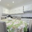 The kitchen is fully equipped with all the appliances including a dishwasher, washing machine, fridge, oven, toaster and microwave.